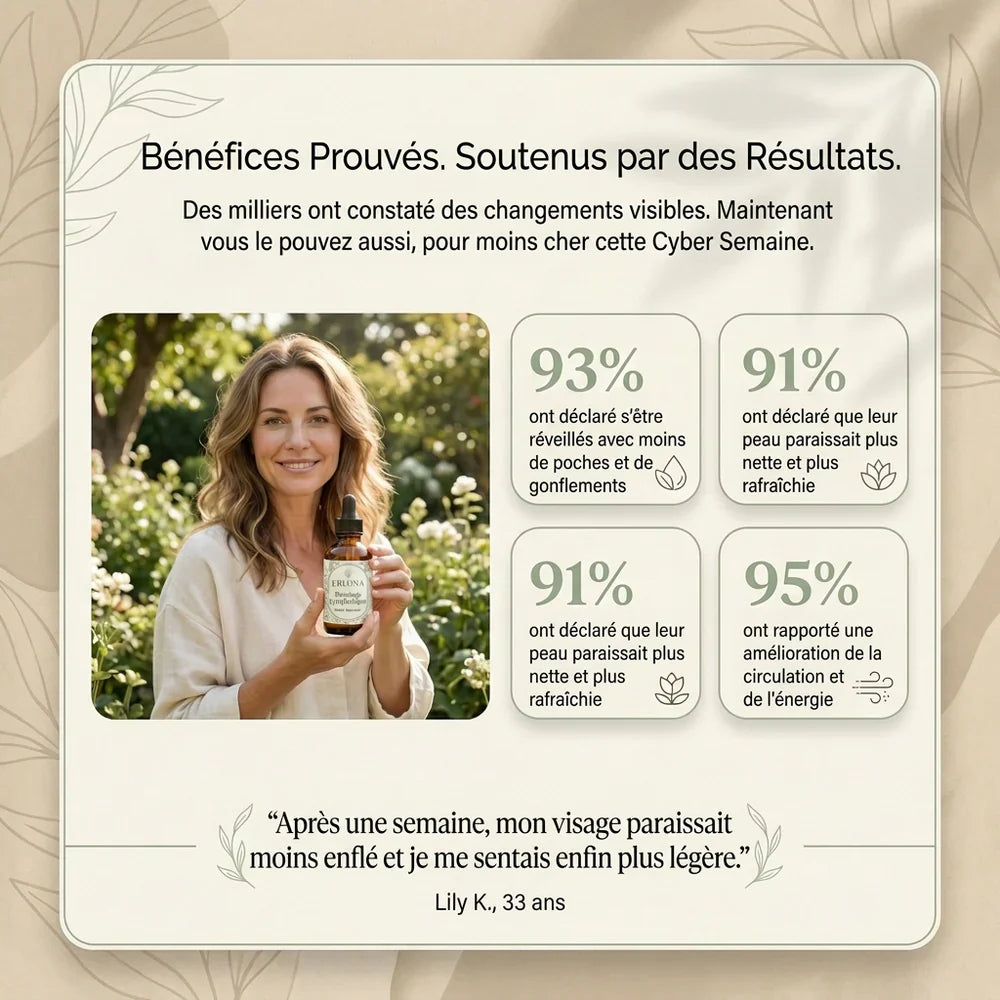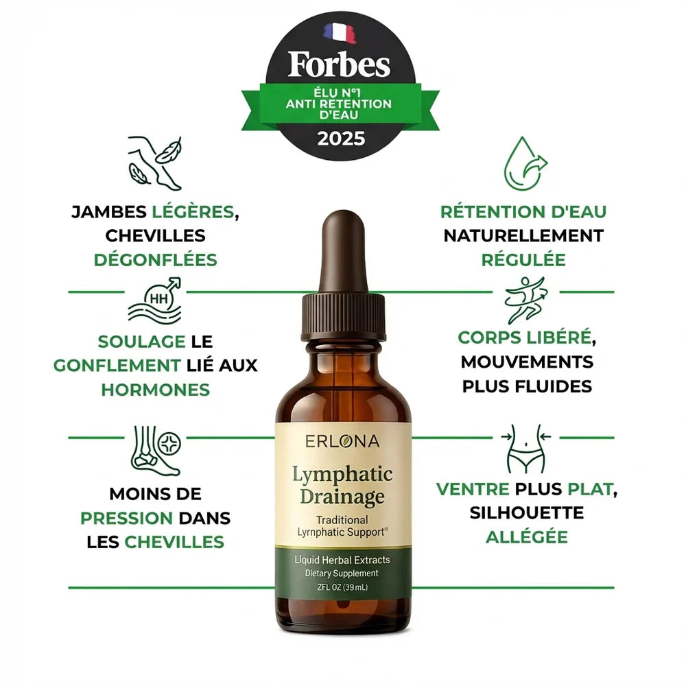 Avec le temps, notre système lymphatique peut se ralentir, provoquant gonflements, jambes lourdes, visage bouffi et fatigue. Erlona® Drainage Lymphatique est formulé à base de 4 extraits botaniques cliniquement étudiés pour stimuler naturellement la circulation lymphatique, réduire la rétention d'eau et retrouver une sensation de légèreté durable — sans effets secondaires.